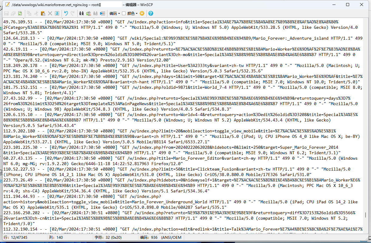 被拦截的包括老版本 Firefox/Chrome/IE/Opera、Win95/98/2000 和 64 位 XP(我想国内肯定没人用这类早该淘汰的操作系统访问 Wiki 吧)、Android 1~3、iOS 3/4(nginx 日志中这两个版本的 iOS 出现频率特别高)、32 位 Linux、PowerPC 版 OS X 及老版本的 Intel OS X。虽然有小概率误伤,但这个措施肯定是有效的。其实这类 ua 当中还有一种特征,就是浏览器语言很多都是小语种,而不是中英文,但我没有按语言进行屏蔽。